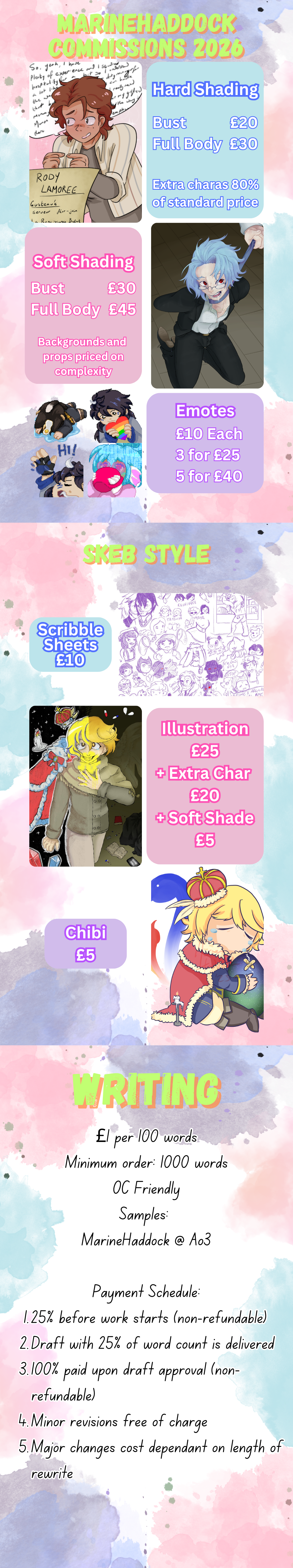 - Prices listed on this page are strictly for non-commercial works. Commercial rights can be discussed but the price will be higher.